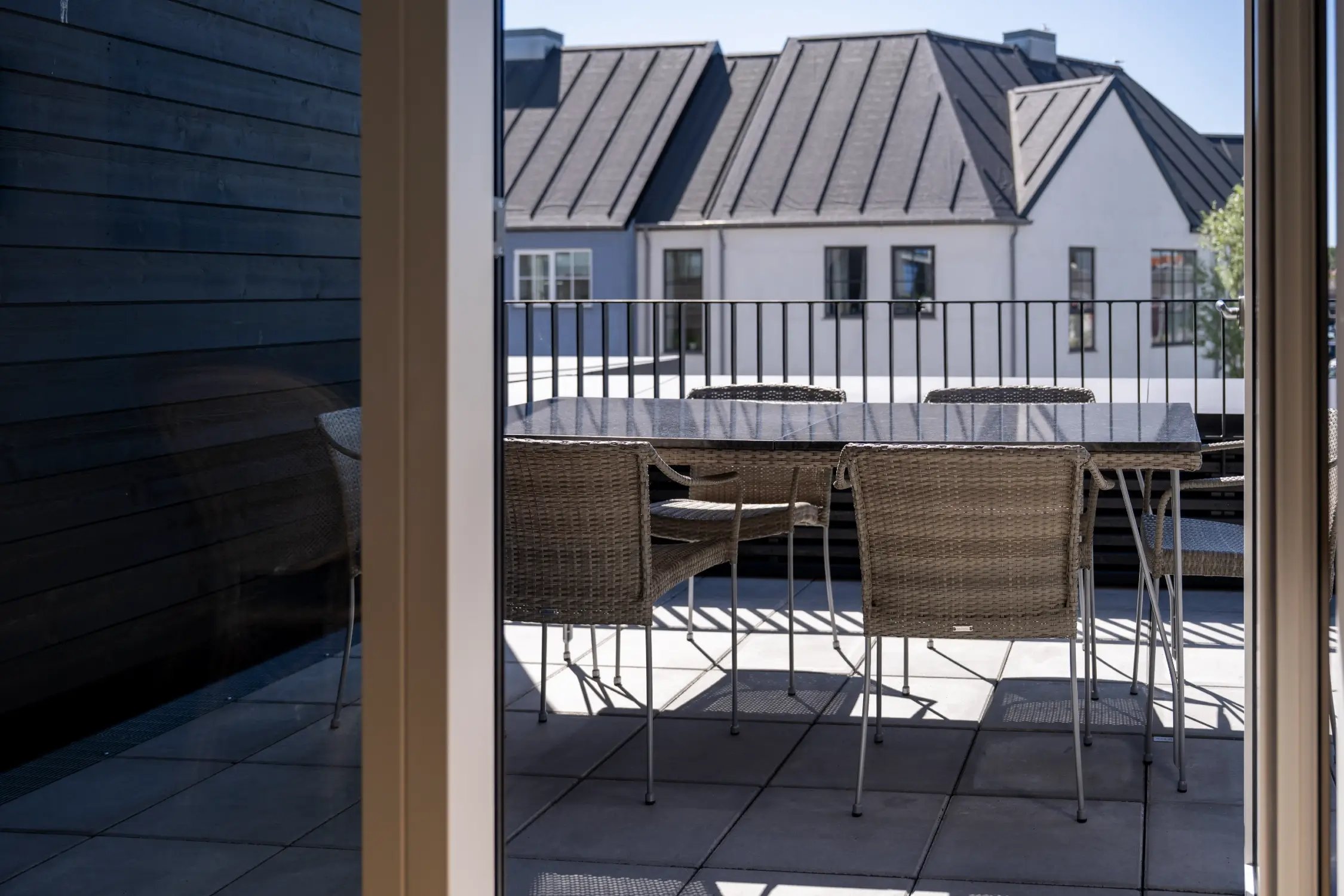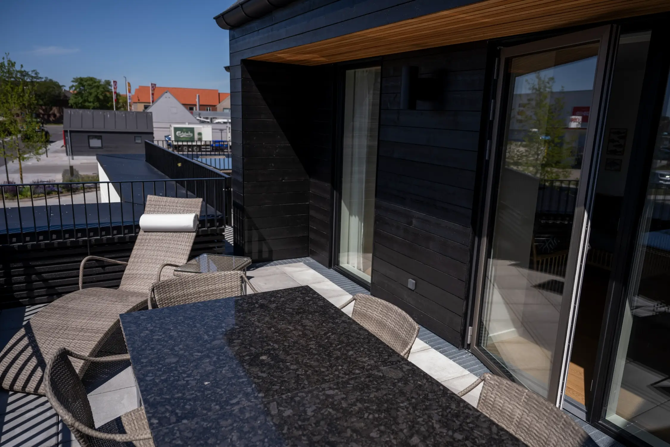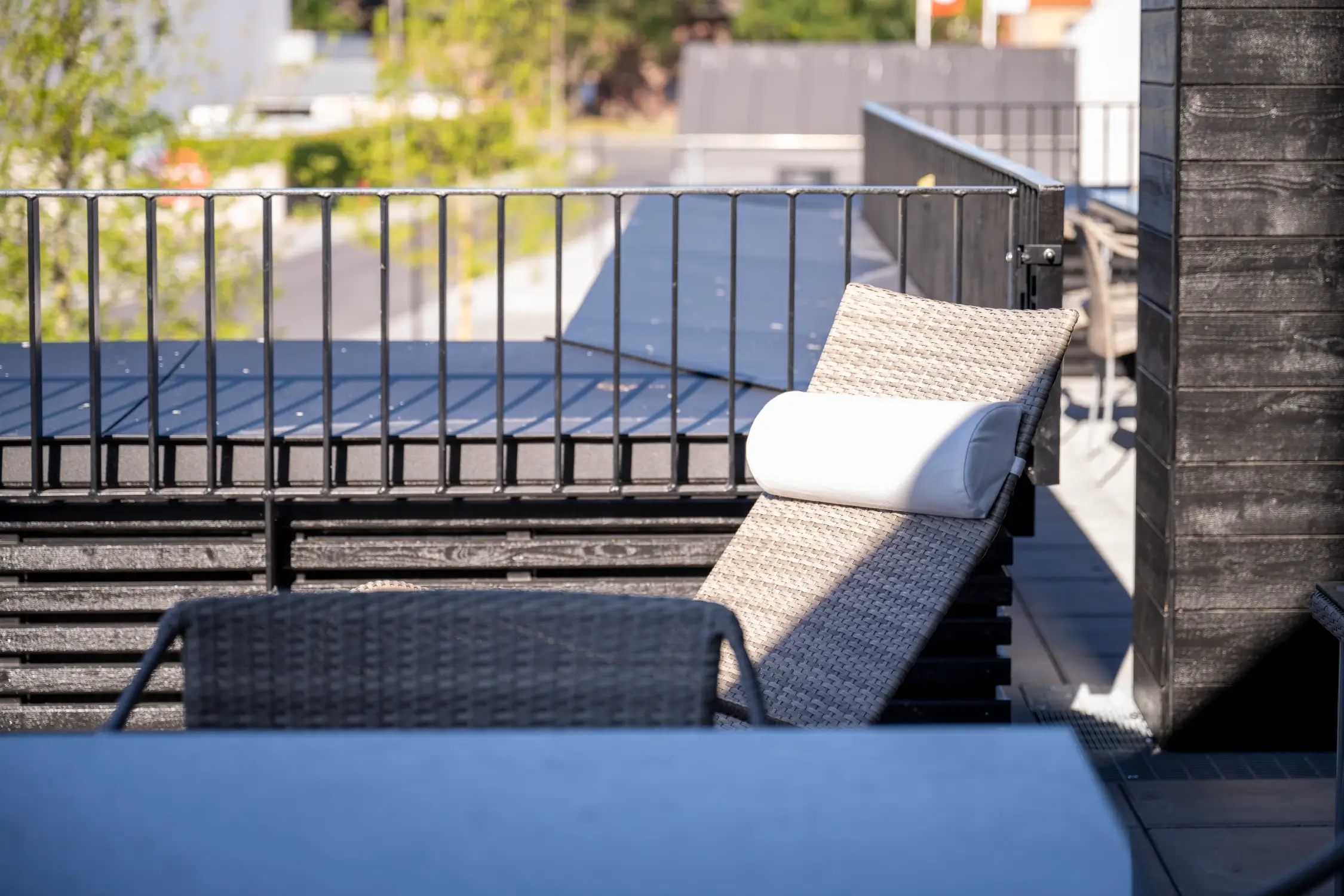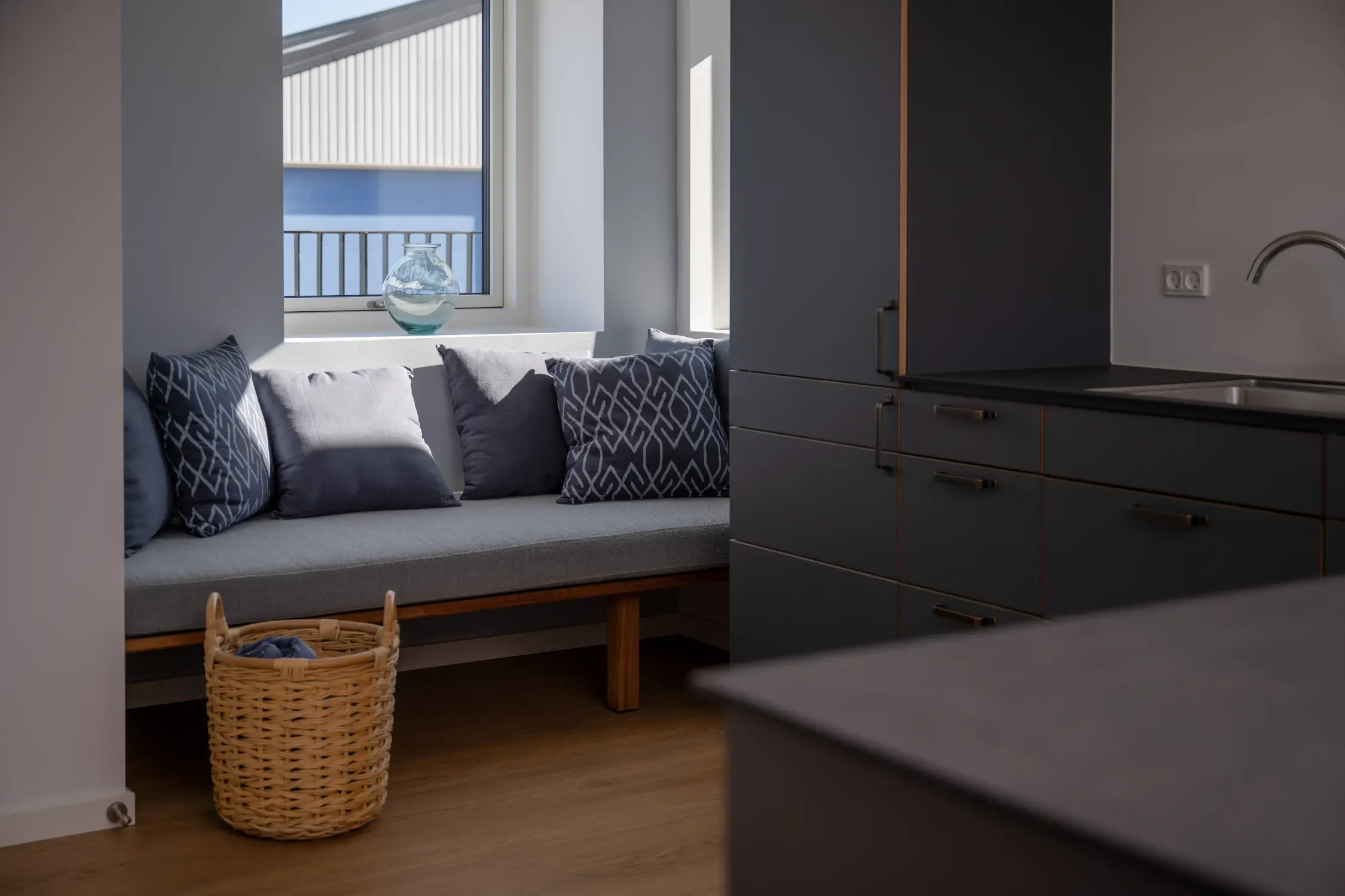 The living room opens onto a private terrace where you can sit in the comfortable garden furniture and enjoy relaxing moments. From here you can look out over the harbor and the city while feeling the fresh sea air.
