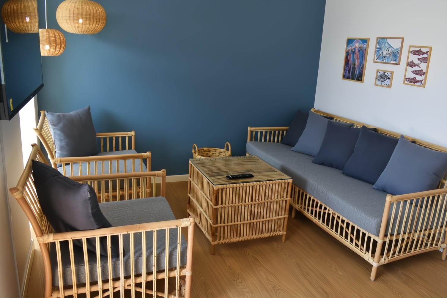 Imagine stepping into an apartment where the calm waves of the ocean and the warm colors of the beach form the perfect setting for your stay. Here, the gentle colors of nature merge with a stylish design, and the interior design is a tribute to the calm sea – from warm sand tones to soothing blue and green shades that reflect the depth of the ocean. The images give an insight into what the apartment will look like and how the interior might appear.