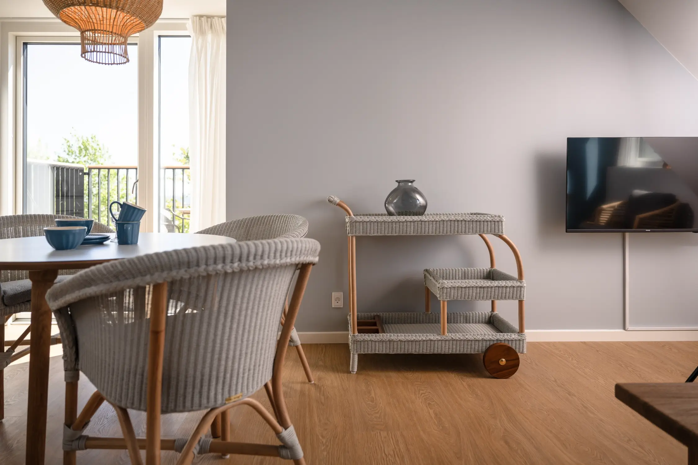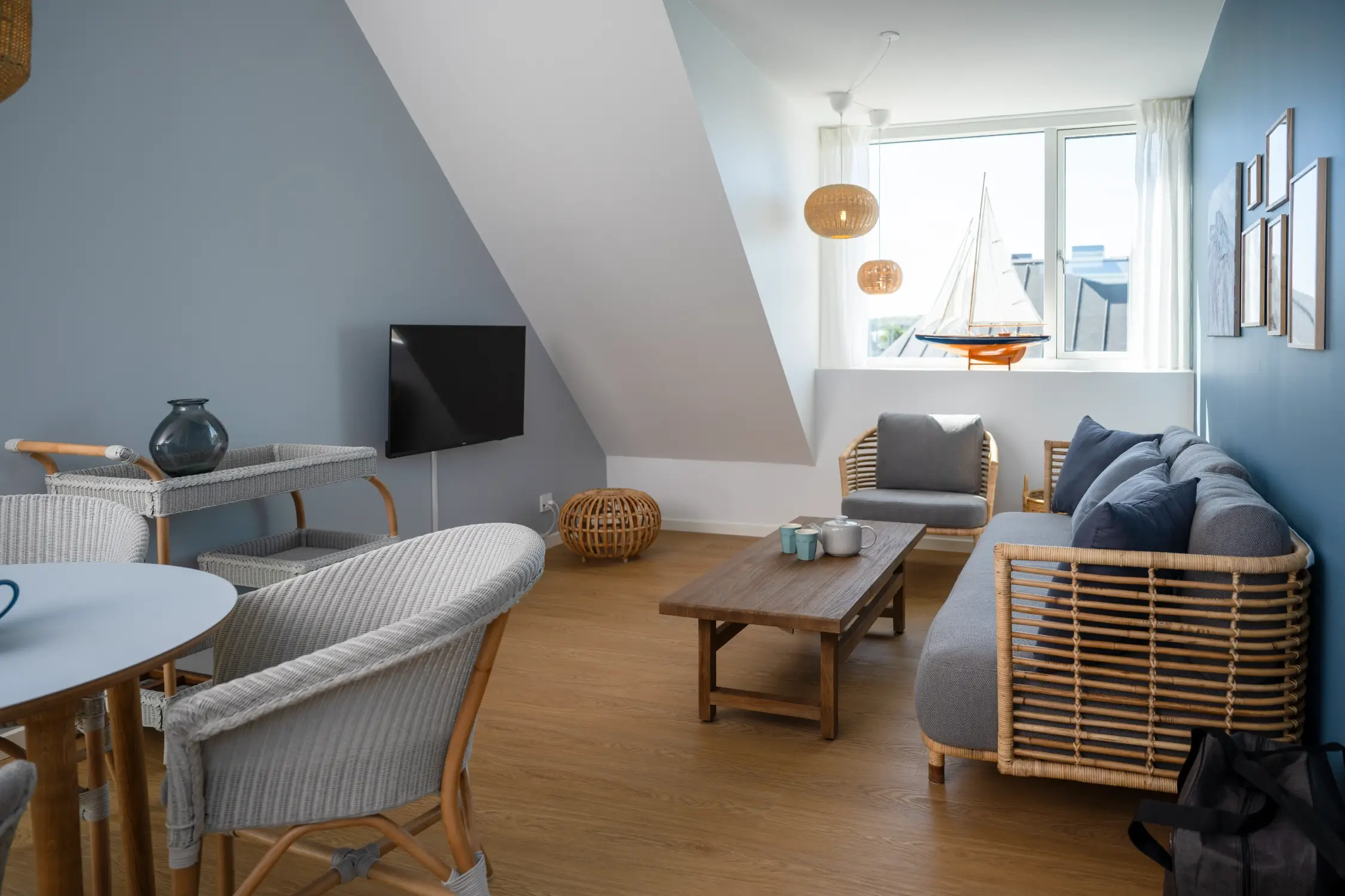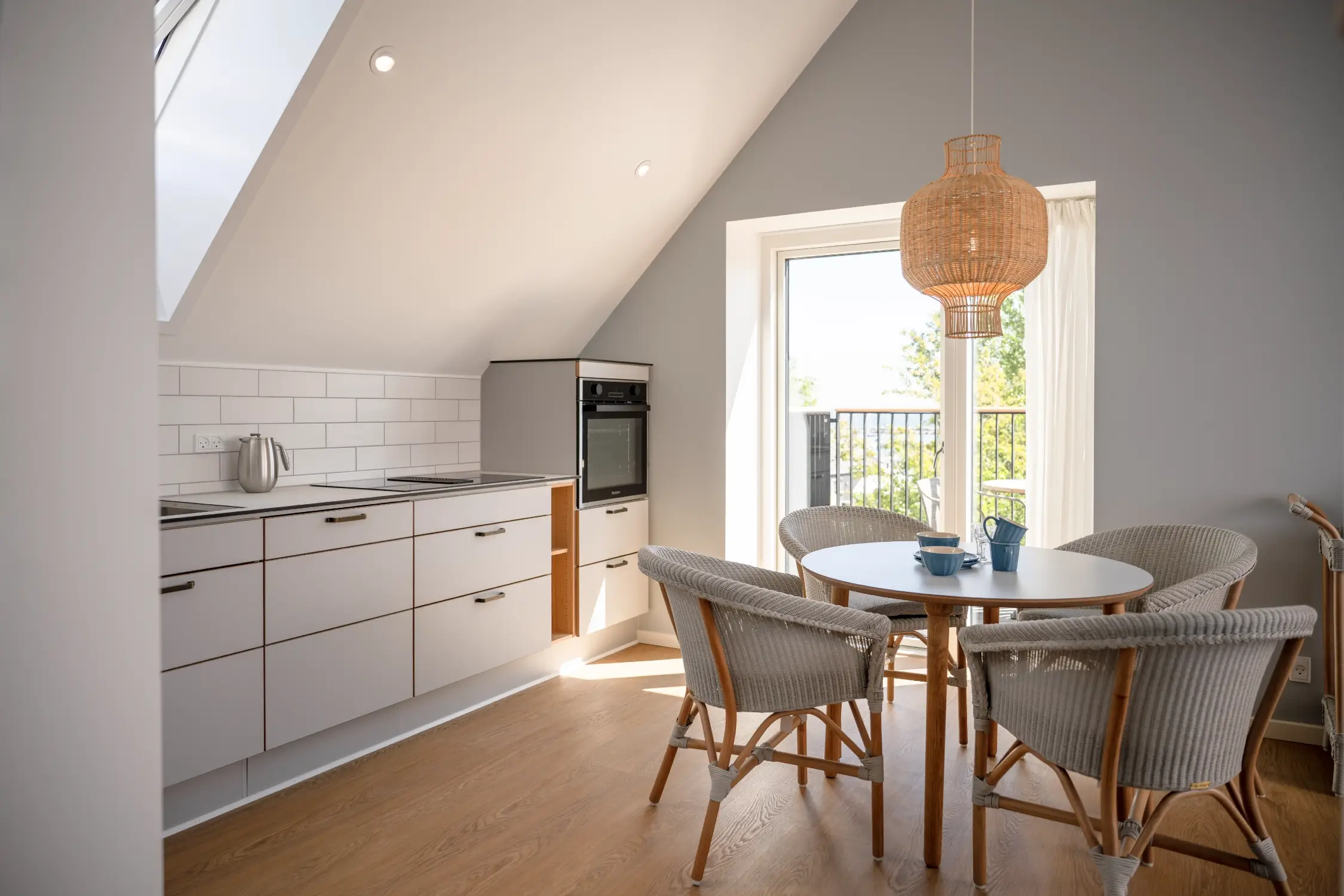 From the living room you have direct access to a private balcony, where you can relax in comfortable garden furniture and enjoy the beautiful view of the harbor – a perfect place to enjoy your morning coffee or a relaxed evening.